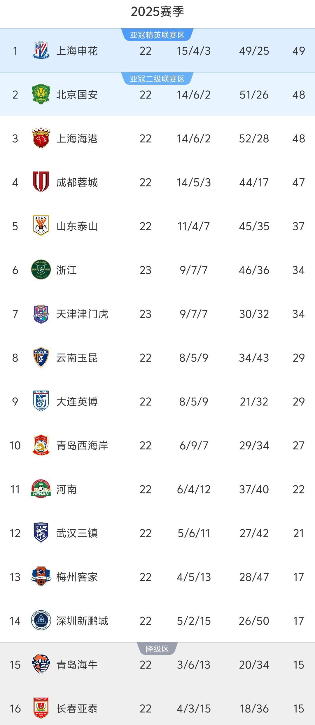 榜尾方面,从第11位的河南队到垫底的长春亚泰,仍要继续为保级而战,其中最危险的是17分的梅州客家、深圳新鹏城以及15分的青岛海牛和长春亚泰。
