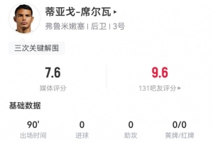 40岁弟媳本场6解围2封堵+1门线解围 5长传5成功 7.6分全队最高