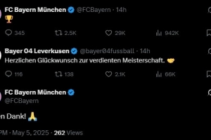 08月 18 2025 0 bob半岛体育官网-Respect!药厂祝贺拜仁夺冠,拜仁官推回复:非常感谢 xiaoqiao 2025-08-18 德甲 90 体育资讯5月5日讯 勒沃库森在今天凌晨的德甲战平后拜仁提前夺冠,赛后,勒沃库森官推向拜仁表示祝贺,拜仁也回应了感谢。 拜仁官推在球队夺冠后发了一个冠军表情,勒沃库森官推随后评论:“祝贺你们夺冠,实至名归🤝” 拜仁官推随后回复:“非常感谢!🙏”
